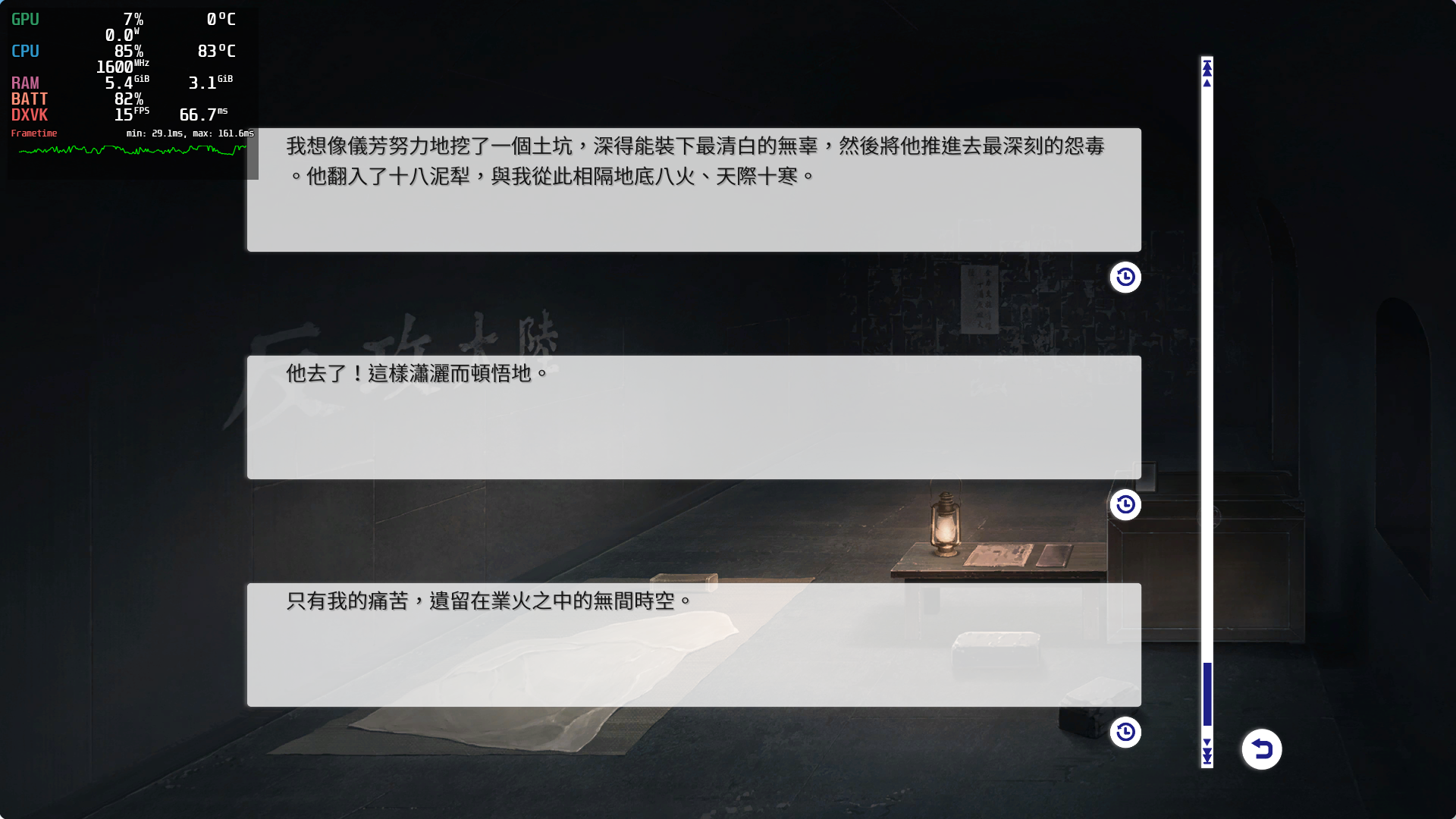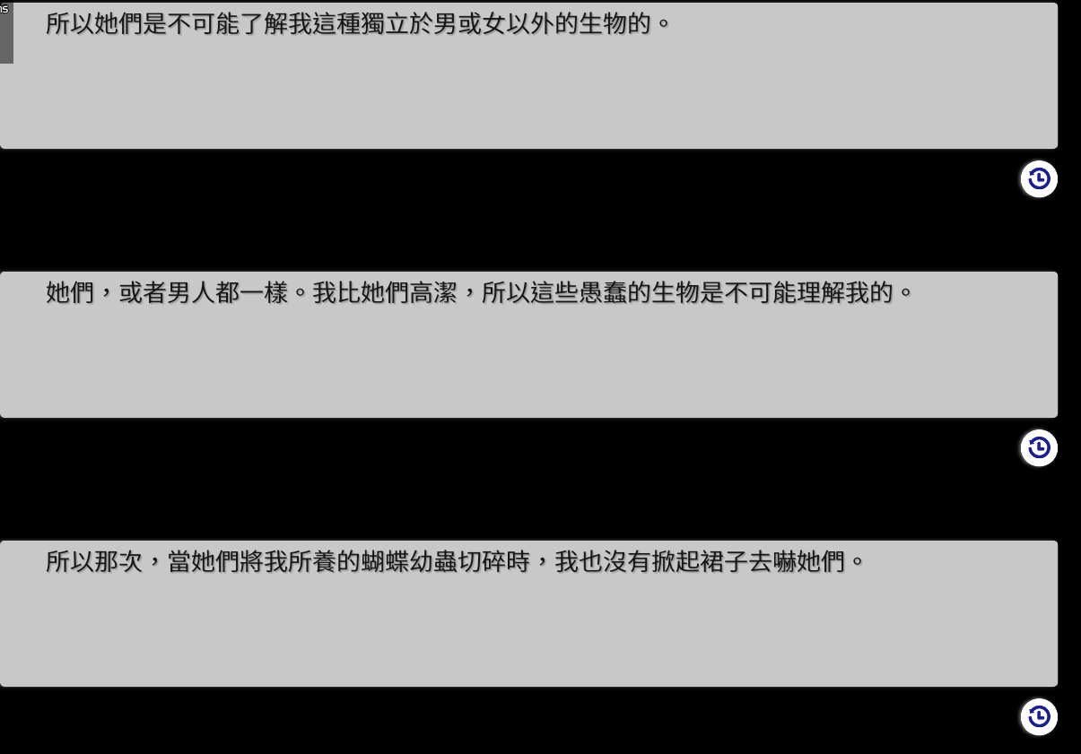 只可惜文字整体上就没那么耐读了:中期剧情模板化太过严重,公式日常之每天上学和神仙对骂三百回合,能忍住不按 Ctrl 快进的也是神人了。感觉全流程 100 个小时里有接近四分之一时间都是在听这些废话,血压控制练习属于是。怪不得断断续续推了两年才结束。